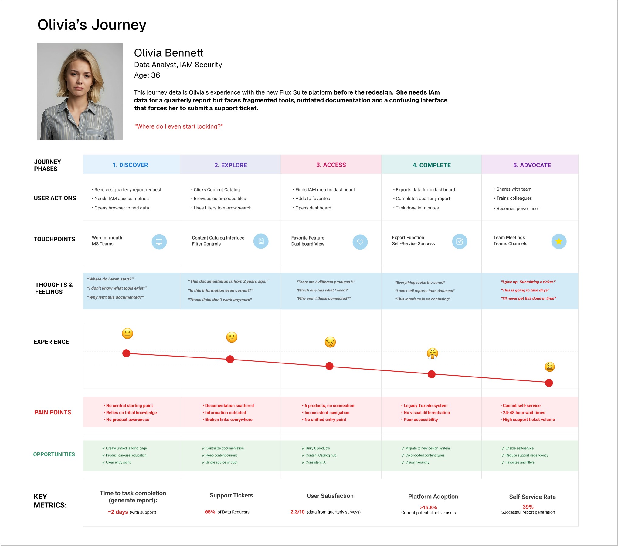 Analysts didn't know where to start. Six products, dozens of outdated Confluence pages, and no clear guidance on which tool did what. They'd search, guess, ask a colleague, submit a ticket — and often still end up in the wrong place. The time lost wasn't just inefficiency. It eroded trust in the platform itself.